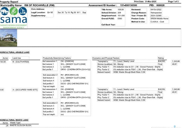 SE 30 16 30 w1 RM 151 Excellent quarter of grainland on good grid 4 miles east of Rocanville. Approximately 15 acres plus yard is to be divided out of the quarter. House well is at the large dugout on west side and there will be an interest registered for use of it by the yard owner. SAMA indicates approximately 133 current tillable acres on land. Good G class soil, Oxbow Sandy Clay loam, level land. Land is rented for the 2026 crop year so a fall winter closing is acceptable. There is a right of first refusal in place for the current renter and they will be given 48 hours to match any offer. Call selling agent for more information.